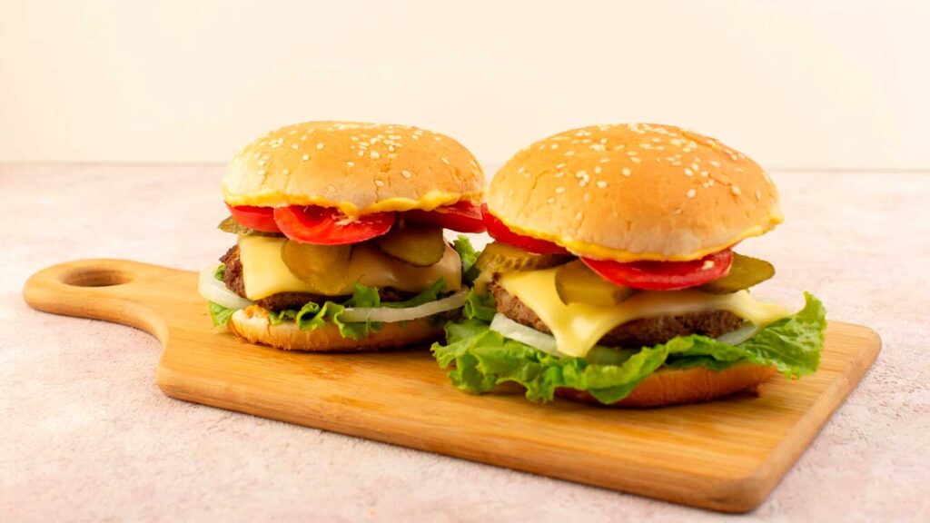 Comida clásica que consiste en un filete de carne molida sazonada, generalmente de res o pollo, cocinado a la parrilla o a la plancha y servido entre dos rebanadas de pan. Las hamburguesas se suelen acompañar de una variedad de ingredientes como lechuga, tomate, cebolla, queso, tocino, pepinillos, salsas y otros condimentos, según las preferencias personales.